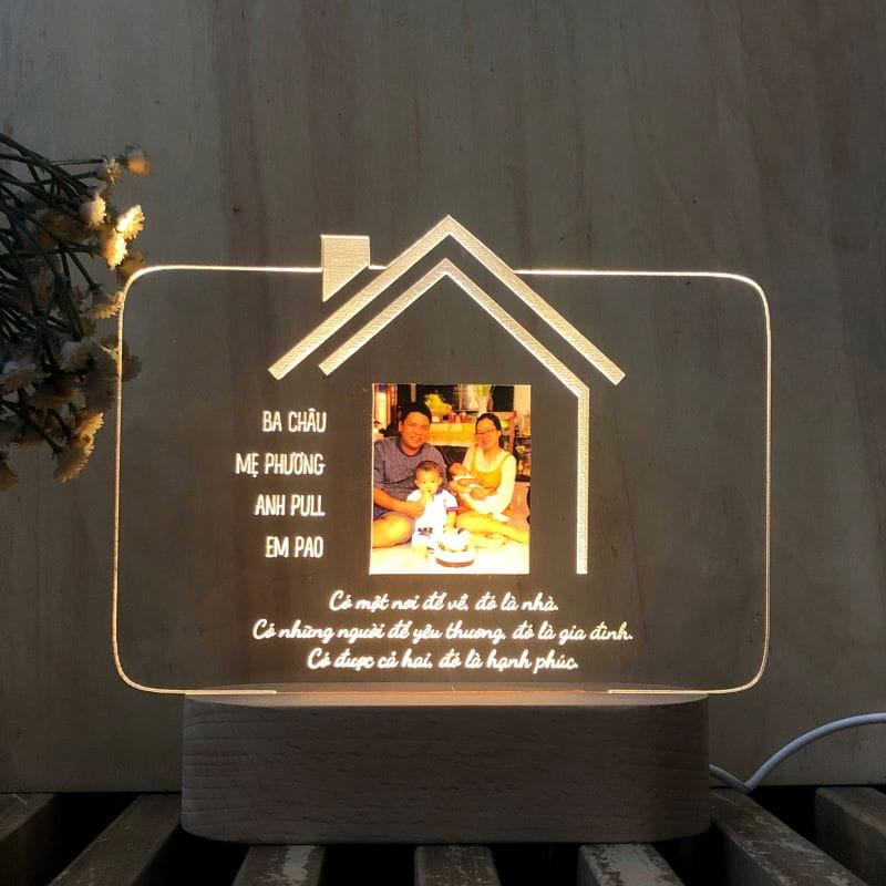 Đèn LED kỷ niệm chương khắc laser/ in UV: Mẫu ngôi nhà, Đế gỗ teak sử dụng pin/ điện